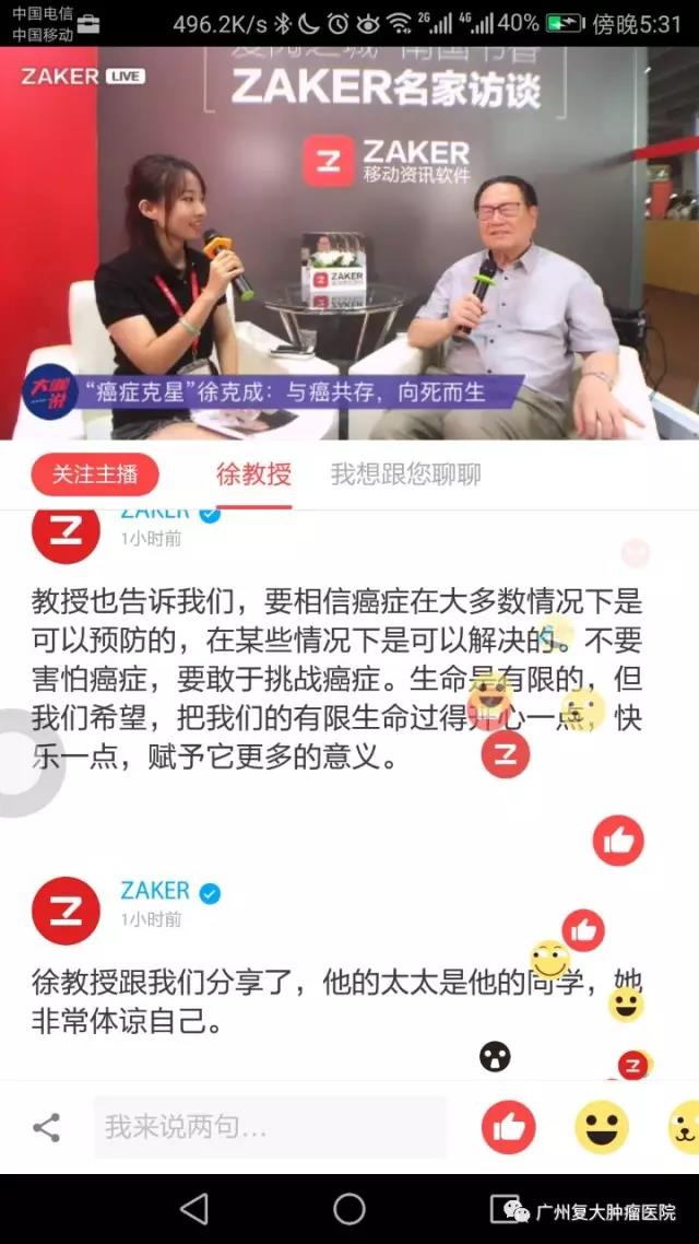 2017年8月11日下午,时代楷模、白求恩奖章获得者、暨南大学附属广州复大肿瘤医院总院长徐克成教授做客南国书香节,在国内有名的互联网资讯阅读平台ZAKER的“名家访谈直播间”与广大网友面对面交流。现场讲解《与癌共存》、《我对癌症患者讲实话》等著作内容,并与网友探讨如何看待癌症发生等问题,直播有近1万多网友在线聆听。